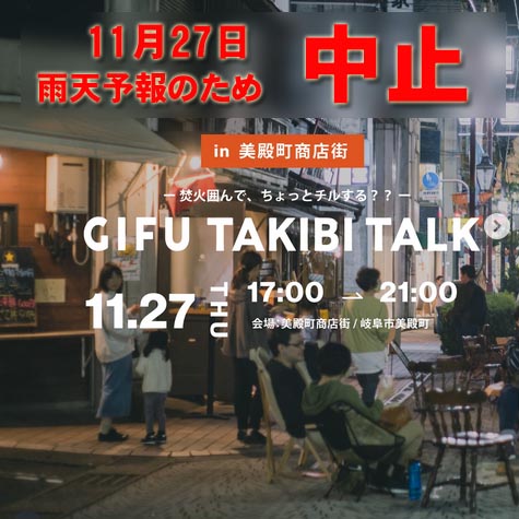 11月27日(木曜) 17時~21時まで開催する予定でした「美殿町たき火トーク」は、雨天予報のため中止します。 開催を楽しみにお待ちいただいた皆様には深くお詫び申し上げます。 前日26日は、翌日の降雨が考えられないほどの晴天ですが、どの天気予報も開催時間となる夕刻から夜にかけて降雨情報となっておりますので、残念ながら【 中止 】を決定させていただきました。 年に二回開催する予定ですので、次回は来年春ごろを計画しています。