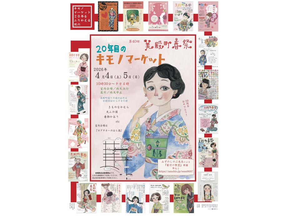 2026年4月4日(土)・5日(日)の二日間、午前10時30分~午後4時まで、美殿町通りを通行止めにして「第40回 美殿町秋祭~キモノマーケット~」を開催します。今年でなんと開催20年目となりました。